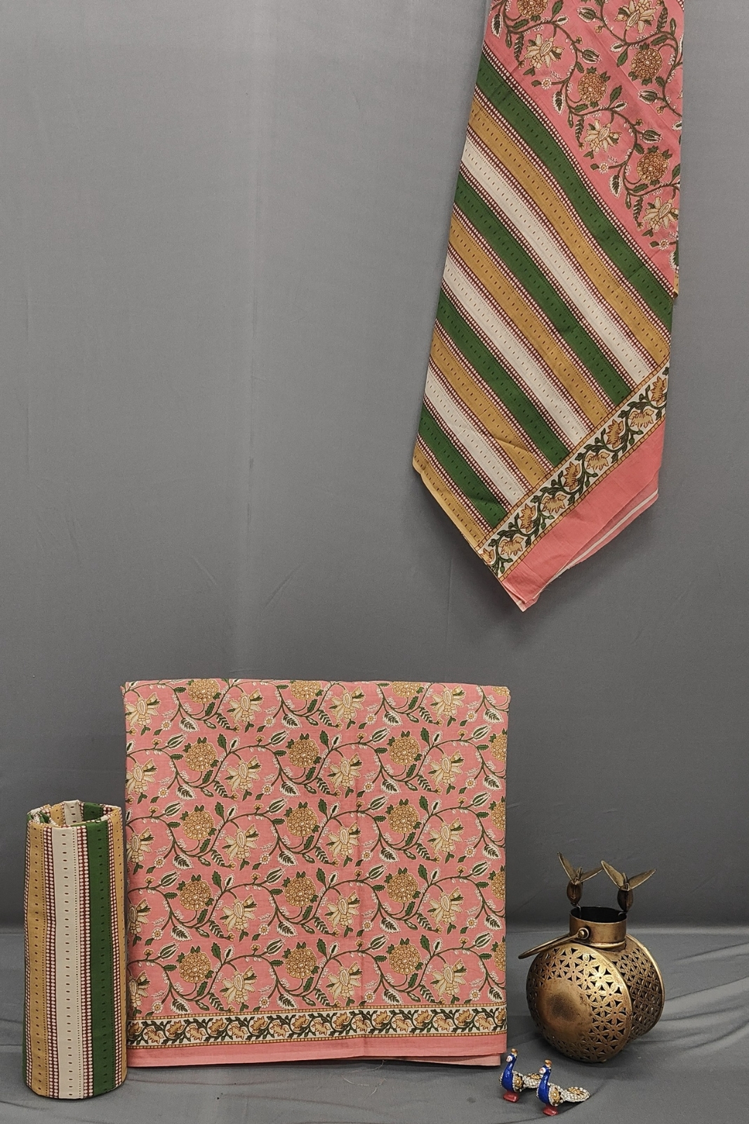 Add a touch of soft elegance to your ethnic wardrobe with this blush pink pure cotton printed suit set from Ekagrata Fashion. Featuring delicate floral vine motifs inspired by traditional Indian block prints, this ensemble reflects grace, charm, and timeless beauty. The soothing pink base is beautifully highlighted with earthy floral patterns, creating a perfect balance of tradition and contemporary appeal.