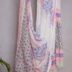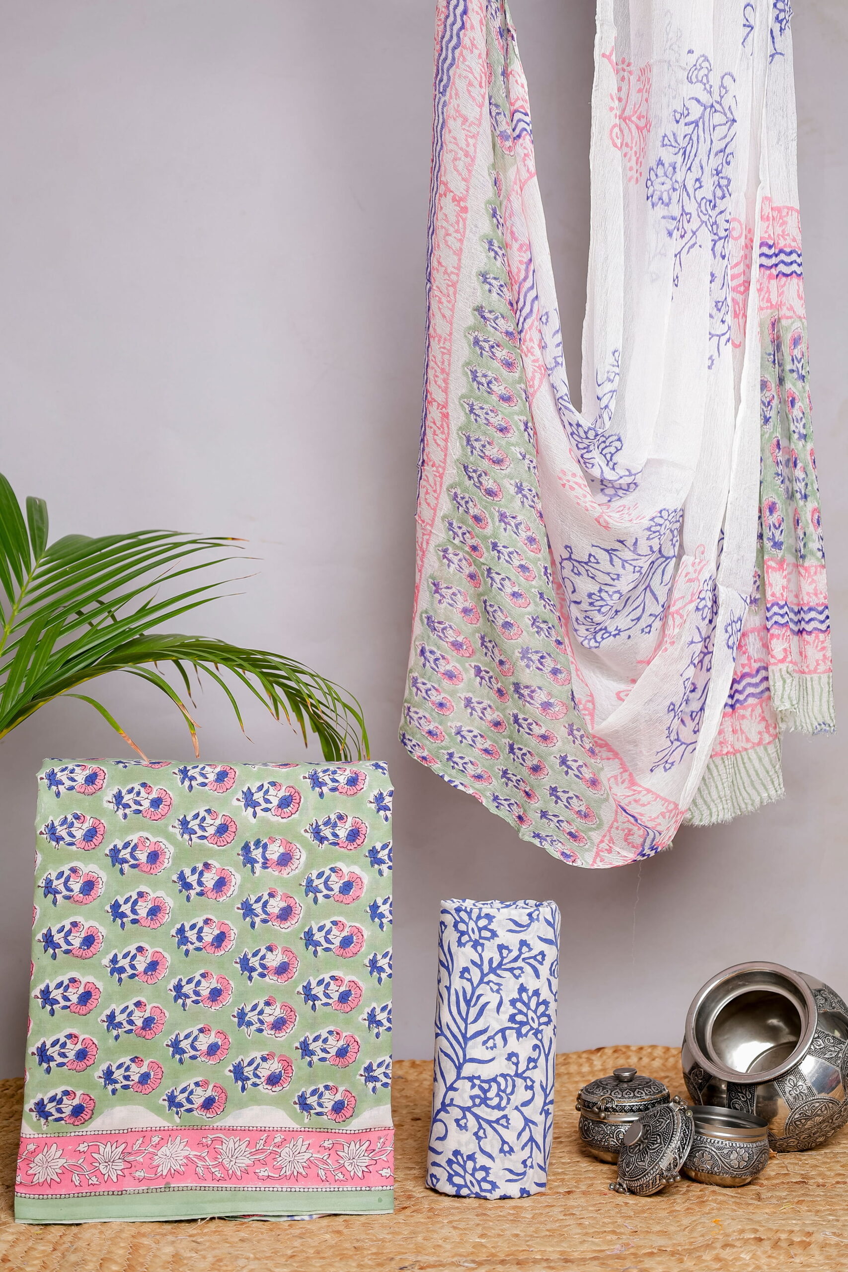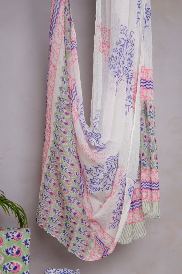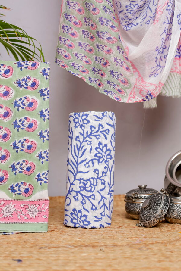 The kurta fabric features delicate floral block motifs in soothing blue and pink tones set against a soft green base, finished with a contrasting printed border that adds a refined touch. The bottom fabric is coordinated in a complementary blue floral pattern, creating a balanced and harmonious look. Completing the set is a lightweight dupatta, adorned with elegant block prints and subtle borders that enhance the overall appeal of the ensemble.