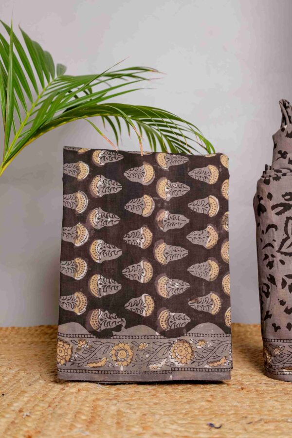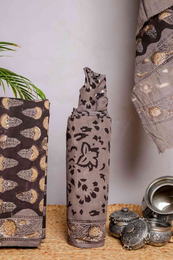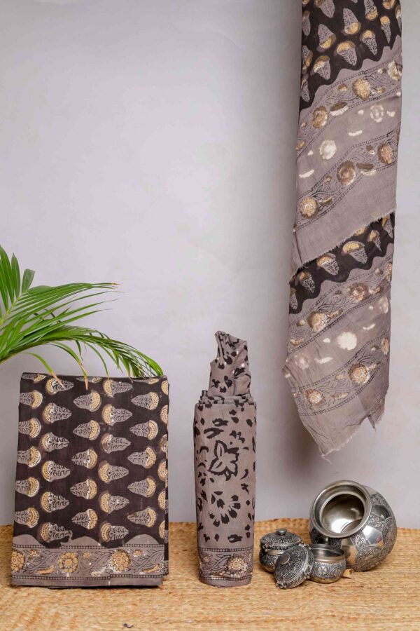 Made in 100% cotton, this Jaota heavy dabu print suit set and dupatta skillfully blends the rich heritage of traditional artistry with contemporary aesthetics. Crafted by skilled artists in the age-old mud printing technique called ‘Dabu’, this unstitched suit set showcases the conventional styles of Rajasthan. The bold printed motif designs, a striking printed border in a range of vibrant colours, add a charming authenticity and balanced sophistication to the final look. The dupatta brings a refreshing, timeless appeal. Its soft, flowy texture ensures effortless draping and all-day comfort, making the suit set a statement piece of any occasion.