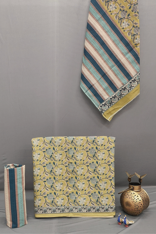 Add a refreshing touch of elegance to your ethnic collection with this lime yellow pure cotton printed suit set from Ekagrata Fashion. Designed with intricate floral vine motifs inspired by traditional Indian block prints, this ensemble reflects timeless beauty with a soothing, contemporary color palette. The soft lime yellow base is gracefully complemented by detailed patterns in muted tones, creating a refined and cheerful look.