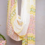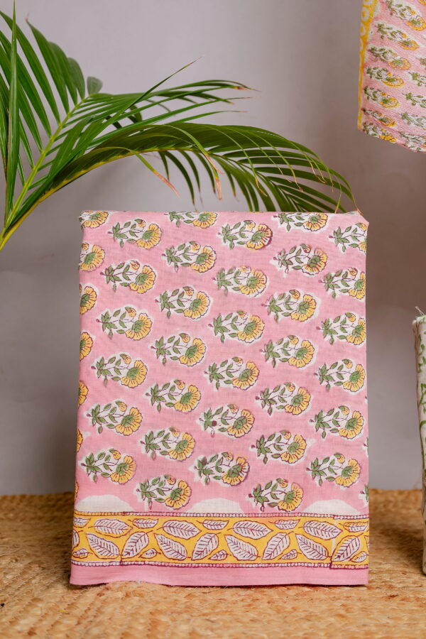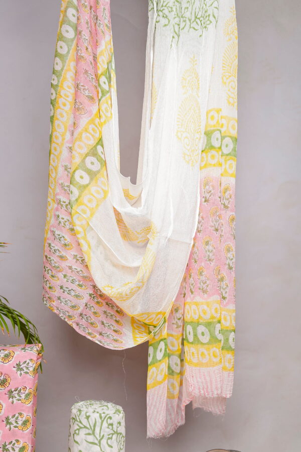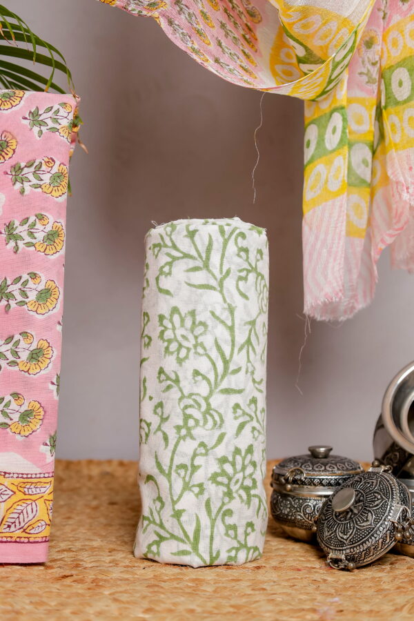 The kurta fabric features delicate floral block prints in yellow and green tones set against a soothing pink base, complemented by a beautifully detailed leaf-patterned border that adds a graceful finish. The bottom fabric comes in a coordinated green floral print, creating a harmonious contrast while maintaining a cohesive look. Completing the set is a lightweight dupatta, adorned with subtle block prints and soft color accents that enhance the overall appeal of the outfit.