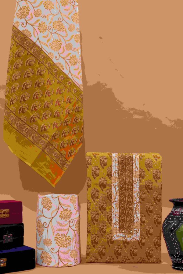 This premium unstitched suit and dupatta set with detailed neck work is a perfect blend of elegance and sophistication. Made from high-quality cotton, the fabric is soft, breathable, and designed to keep you comfortable while maintaining a graceful and refined look. The designs come in a variety of colours, all with an alluring, intricate floral handblock print, which adds a timeless charm to the final look. The fabric comes with a delicately printed patterned neck work that gives the outfit a premium look, making it ideal for festive occasions, casual gatherings, or even semi-formal events. The floral motifs spread across the kurta offer a refreshing vibe, blending traditional craftsmanship with contemporary aesthetics.