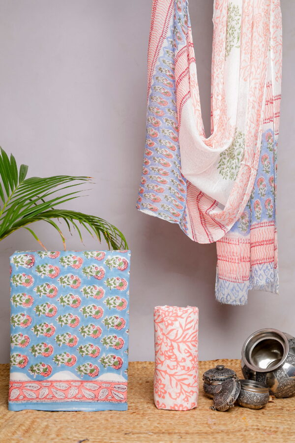 The kurta fabric features delicate floral block motifs in peach and green hues set against a soothing sky blue base, finished with a neatly detailed border that adds a graceful touch. The bottom fabric comes in a coordinated peach floral print, offering a subtle contrast while maintaining a harmonious look. Completing the set is a lightweight dupatta, beautifully adorned with complementary block prints, stripes, and soft borders that enhance the overall elegance of the outfit.